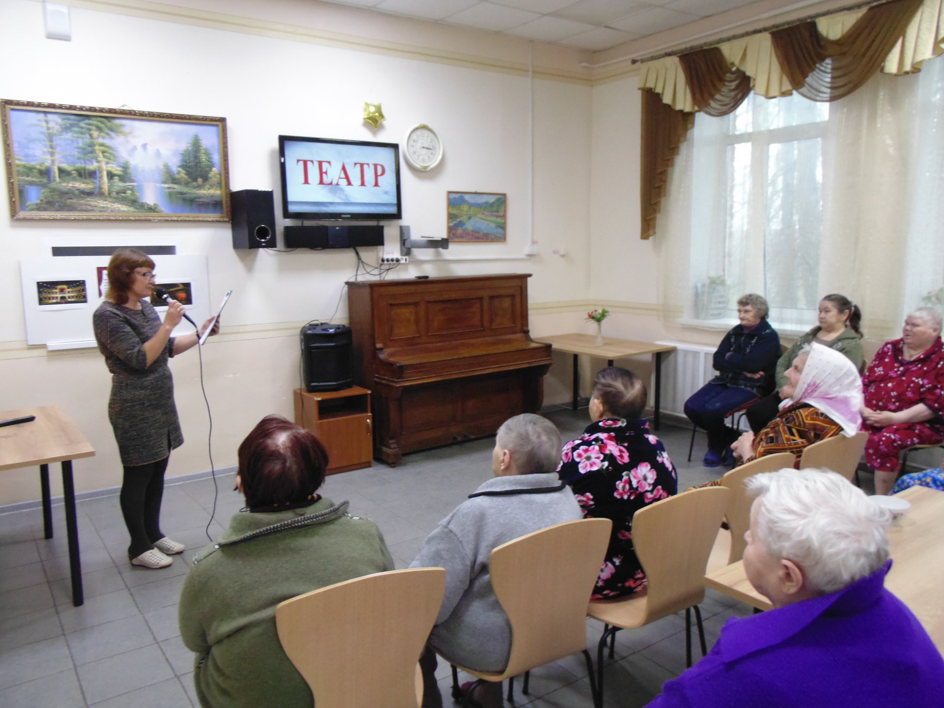 22 октября 2019 года в Оргтрудовском доме-интернате для престарелых и инвалидов состоялось заключительное мероприятие, посвящённое Году театра в России. Культорганизатор Гайдуль А.В. провела беседу-презентацию на тему: «Что такое театр?» Получатели социальных услуг слушали стихи о театре, спектакле. Они заочно побывали в Московском художественном театре и посмотрели отрывок из спектакля «Энергичные люди». В заключение была проведена викторина для присутствующих «Что мы знаем о театре». Получатели социальных услуг приняли в ней активное участие.