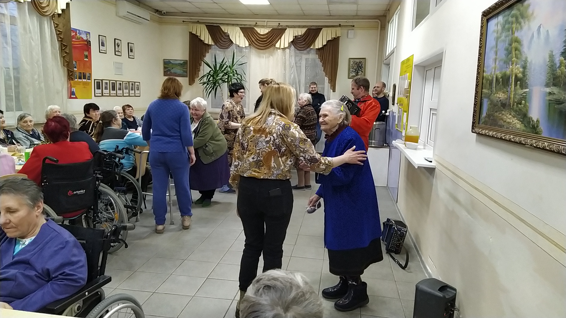 Для подопечных интерната добровольцы организовали застолье, каждому получателю социальных услуг вручили подарки, но больше всего их порадовало выступление гармониста Петра. Все вместе, с огромным довольствием пели застольные песни, частушки, танцевали и смеялись от души. Встреча получилась по-настоящему душевной и запоминающей.